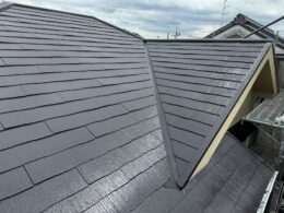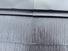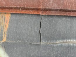 ⇧大きな割れがあったのでスレート用の補修材で補修後に塗装をさせて頂きました、コーキングよりも何十倍も強いので安心です。